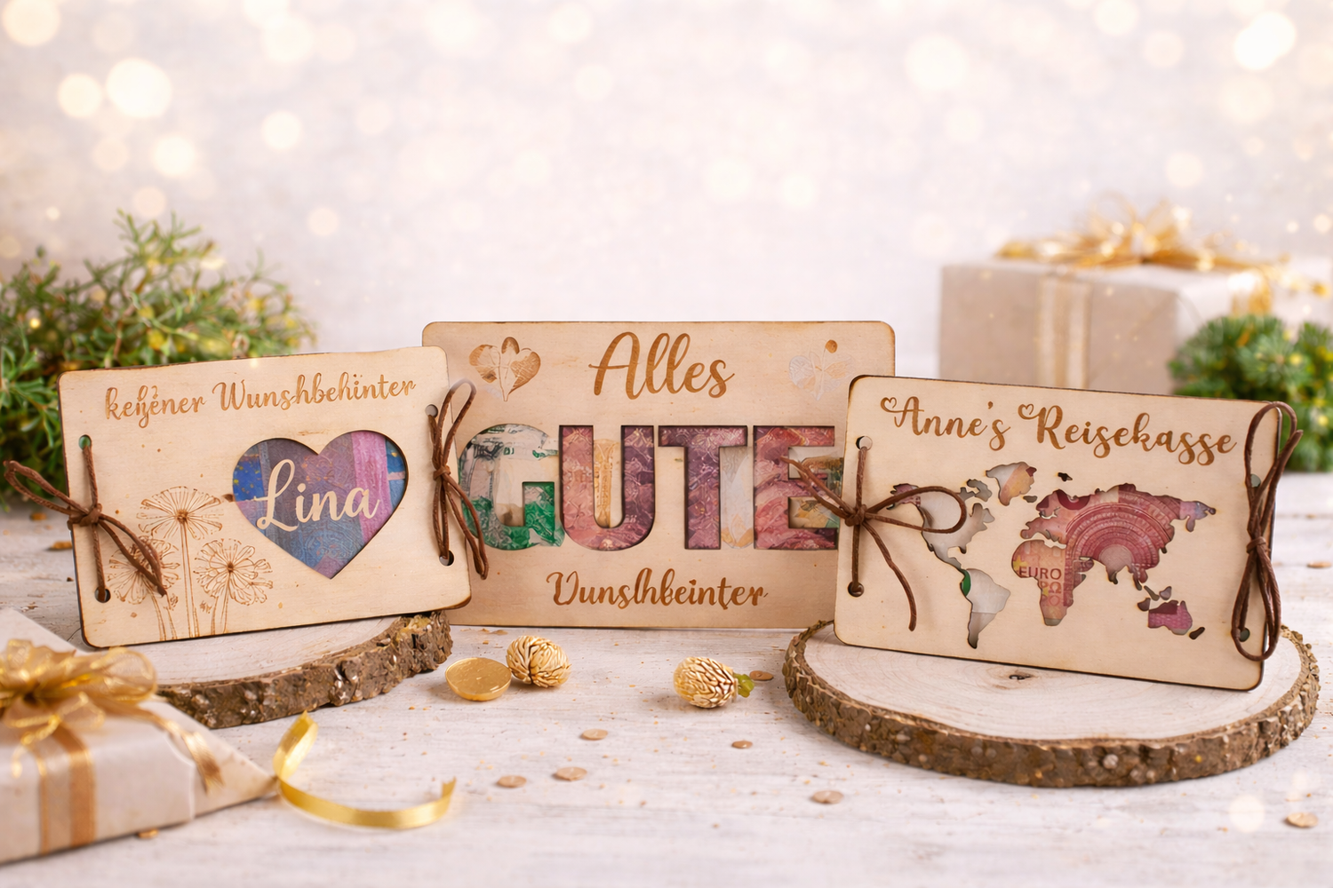 Personalisierbares Geldgeschenk aus Holz – Kleiner Wunschbehälter mit Name