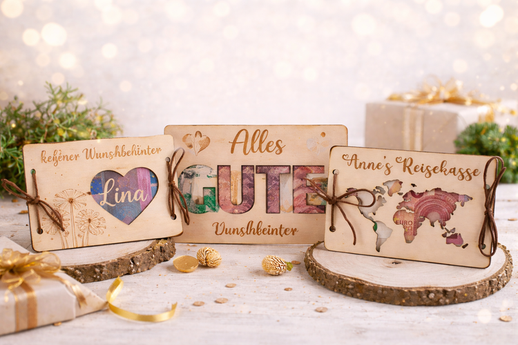 In unserer Kategorie Geldgeschenke findest du liebevoll gestaltete Holzkarten und Geschenkideen, mit denen Geldscheine oder Gutscheine stilvoll überreicht werden können.
