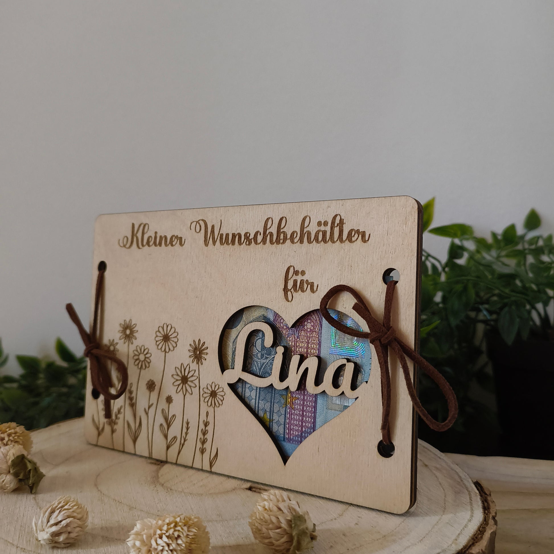 Das feine Blumenmotiv und der Herz-Ausschnitt machen das Design besonders. Das Highlight: Der gewünschte Name wird im Herz eingesetzt, sodass aus einem Geldgeschenk ein echtes Erinnerungsstück wird.